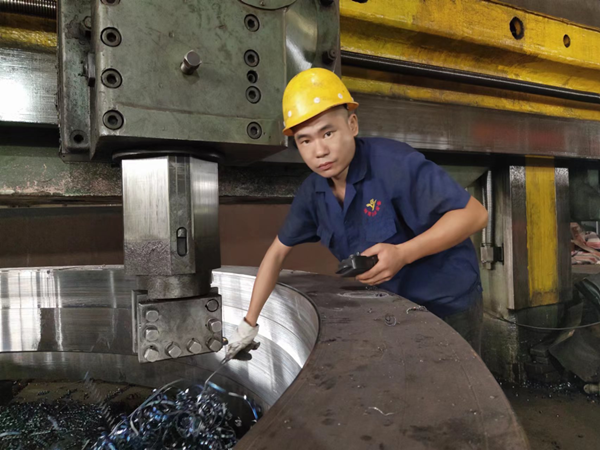 他為人憨厚老實,吃苦耐勞,服從安排,任勞任怨,做事專注細(xì)致,被張主任看在眼里記在心里。因此當(dāng)8米立車一名師傅辭職后,他便按照“量才配崗”的原則,立即把趙江調(diào)到立車崗位,每天親自教他操作立車。通過他的嚴(yán)格要求,加上趙江堅持不懈的努力,他終于熟練掌握了立車的操作技術(shù)。如今,他在立車崗位上己經(jīng)做了兩年,前后己帶了兩位徒弟。每當(dāng)同事夸他上手快時,他卻覺得自己的技術(shù)離師傅還有很大差距?!凹埳蠈W(xué)來終覺淺,絕知此事要躬行。張主任的親自教導(dǎo)、我從書本上自學(xué)來的知識,自己按條條框框操作,這是打基礎(chǔ)。領(lǐng)悟了圖紙的加工要求后,在保證質(zhì)量的前提下,編寫好程序、各項參數(shù)、速度(包括進(jìn)給速度和轉(zhuǎn)速)后,我還必須隨時觀察車床上的一舉一動,監(jiān)管加工全過程,在工作實踐中不斷發(fā)現(xiàn)問題、思考問題、解決問題、總結(jié)經(jīng)驗。當(dāng)我能對具體問題具體分析具體解決并游刃有余時,我就從操作工變成師傅了,”趙江說。